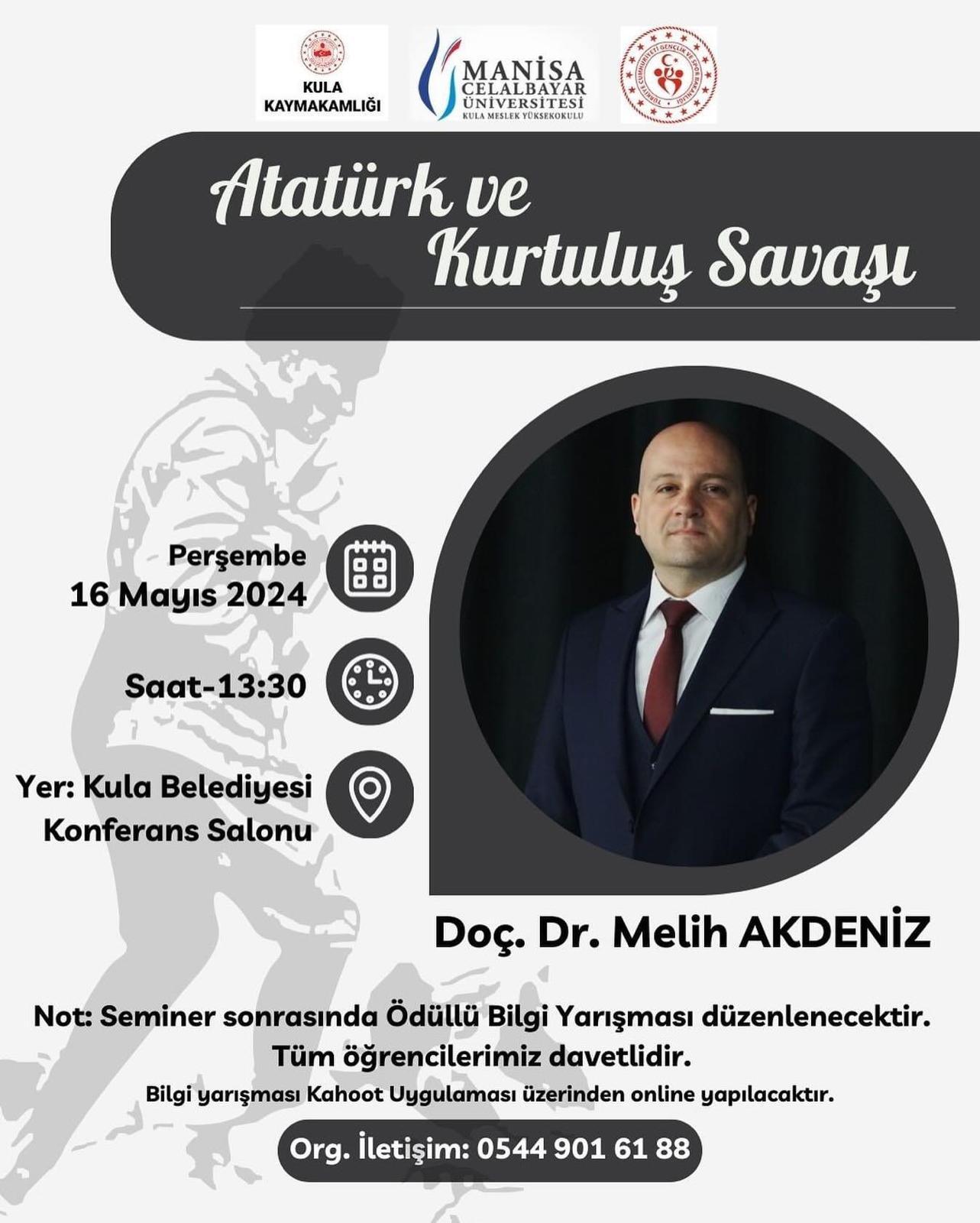 Etkinlikte ilk olarak MCBÜ Salihli MYO Öğretim Üyesi Doç. Dr. Melih AKDENİZ tarafından “Atatürk ve Kurtuluş Savaşı” konulu seminer gerçekleştirildi. Seminerin ardından Kula Kaymakamı Ömer Ahmet ÖZDEMİR tarafından Doç. Dr. Melih AKDENİZ’e çiçek ve teşekkür belgesi takdimi yapıldı.